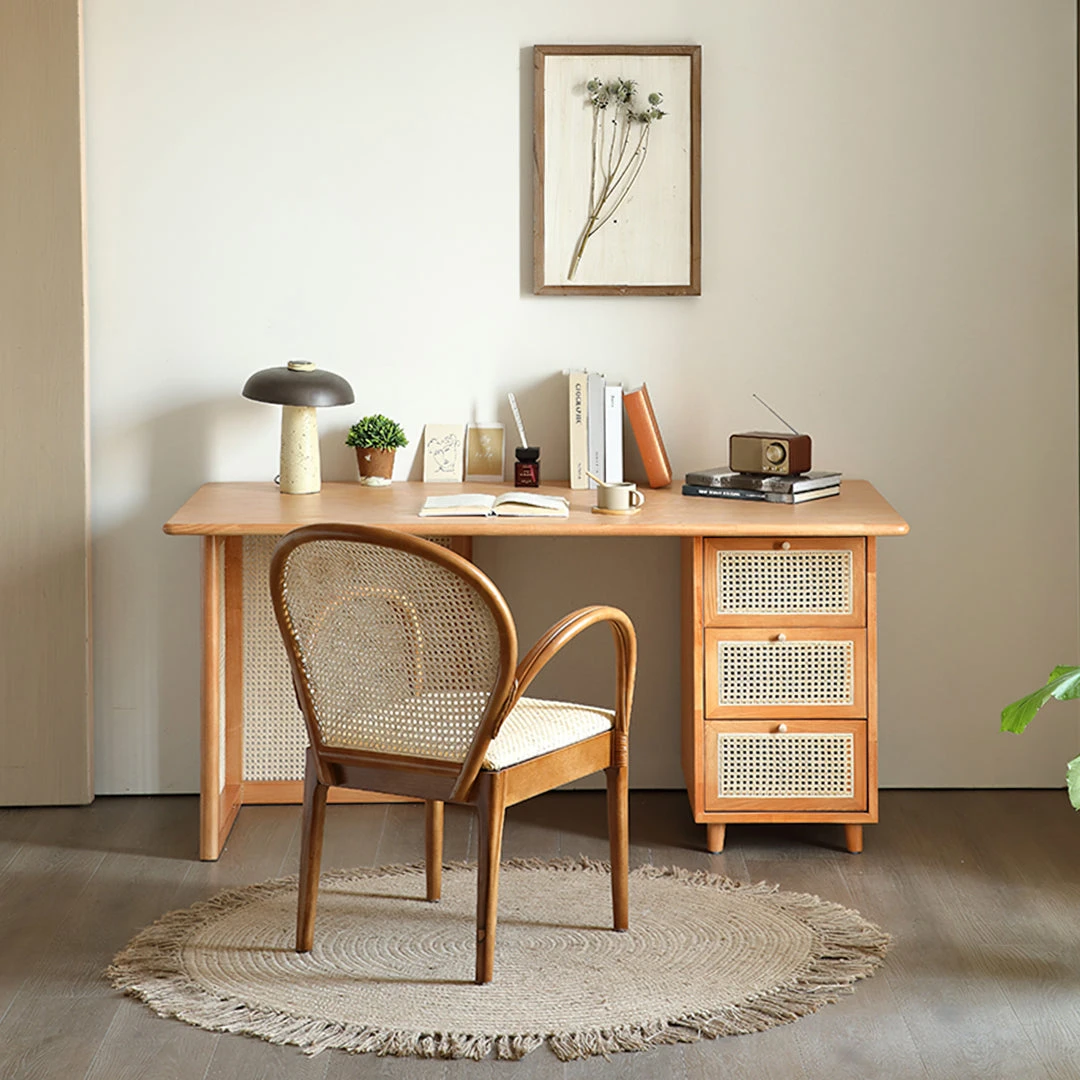 | Material | Desk: Ash Wood, Rattan Chair: Ash Wood, Rattan, Linen, High Density Sponge |
